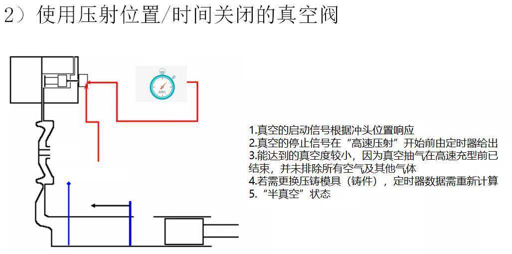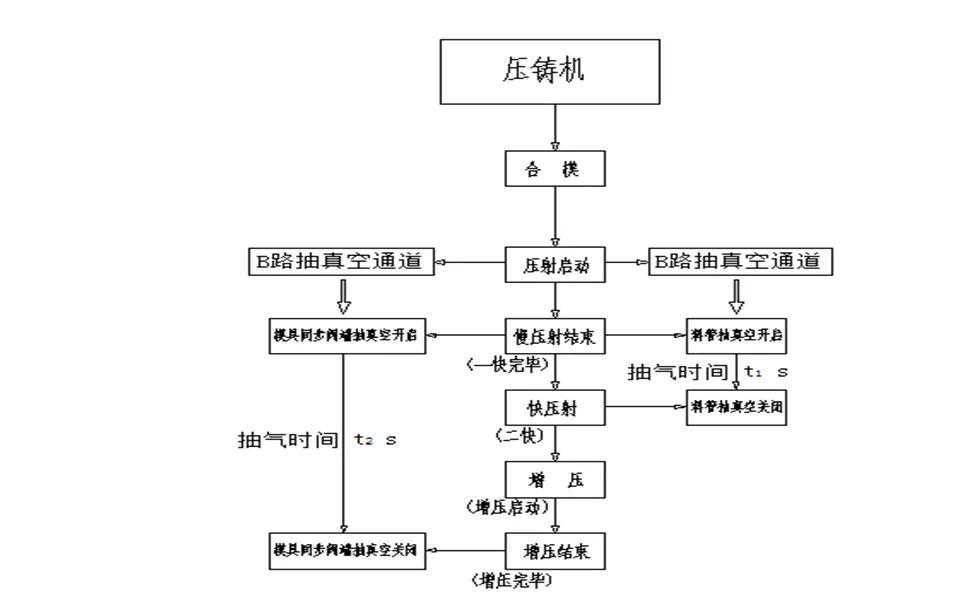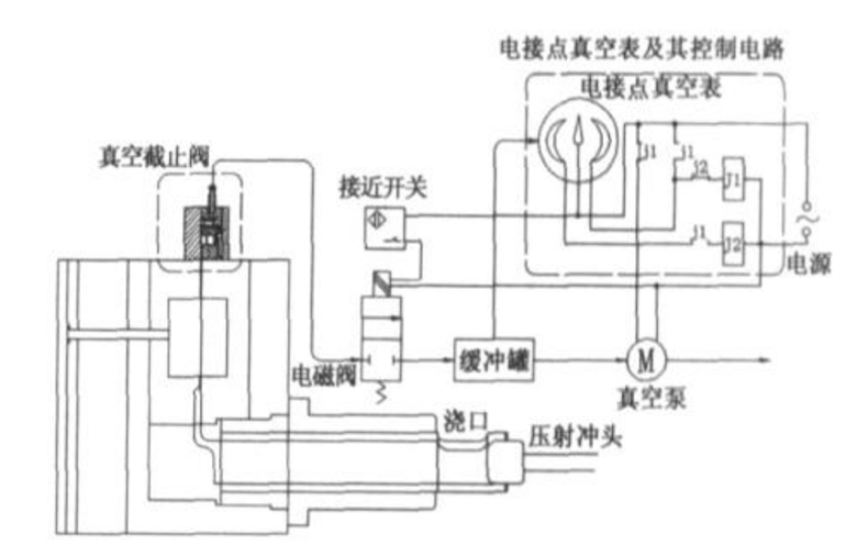 真空系统按压铸机工作顺序在合模限确认后;压射启动,当压射机构的压射杆连接的柱塞头前进,移动至料管的注料口后时,形成模具型腔与料管之间的封闭状态,此时真空系统的储气罐输出管道上的阀门开启执行抽气;压射经快压射、增压完毕后停止并关闭真空系统的阀门,停止抽气。