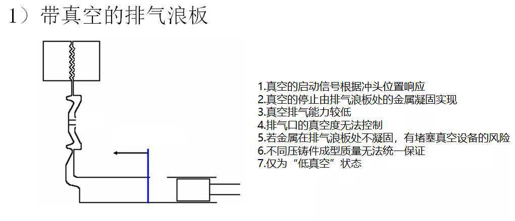 真空压铸利用渣包引出几路气槽至模架,连接定制的排气板或机械式同步截止阀,再与真空系统的抽真空管道连接。