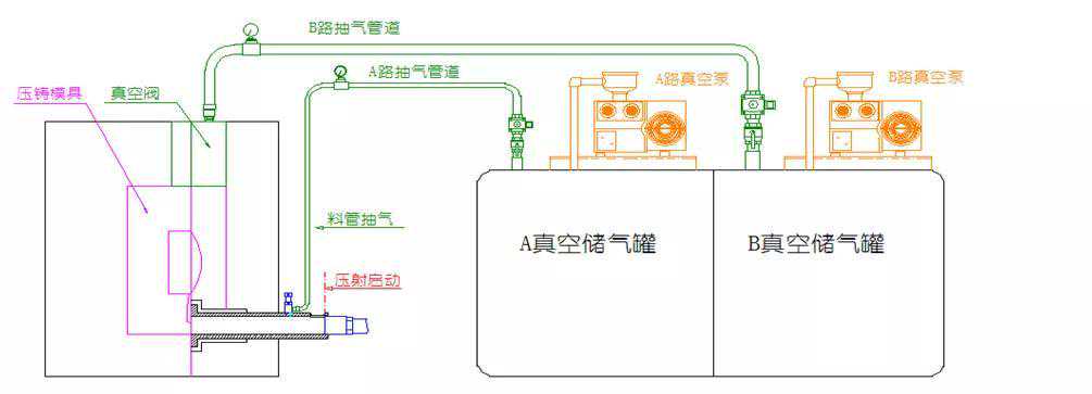 普通真空压铸的装置一般采用1台高速率、低燥声旋片式真空泵,储气罐与模具型腔体积比不低于200:1的配制储气罐进行抽气。