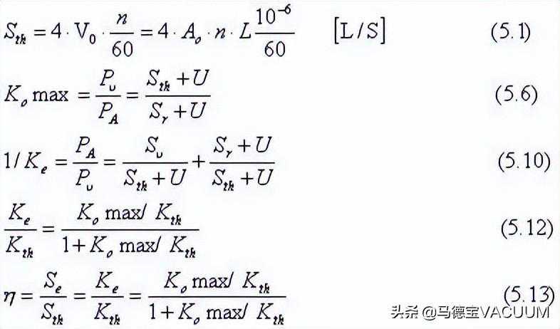 用容积效率η表示罗茨泵机组(即罗茨泵)的有效抽速Se与罗茨泵(机组)的理论抽速Sth之比,则据公式(5.9)、(5.11),可得(5.13)