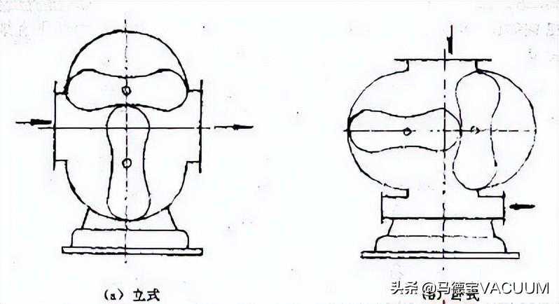 1、立式罗茨泵如图3(a)所示,这种结构的进、排气口水平设置,装配和连接管路都比较方便。但泵的重心较高,在高速运转时稳定性差,故这种型式多用于小泵。