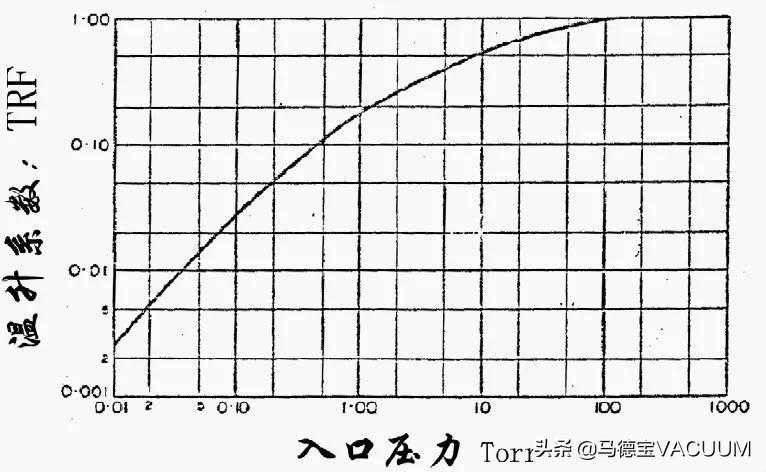 由图5得知:在入口压力为200Torr时,则得TRF=1.0,在入口压力下降时,TRF值也下降,在10-2Torr时,=0.0027。举例说明:在入口压力为10-1Torr时,压缩比为10时,计算平均温升