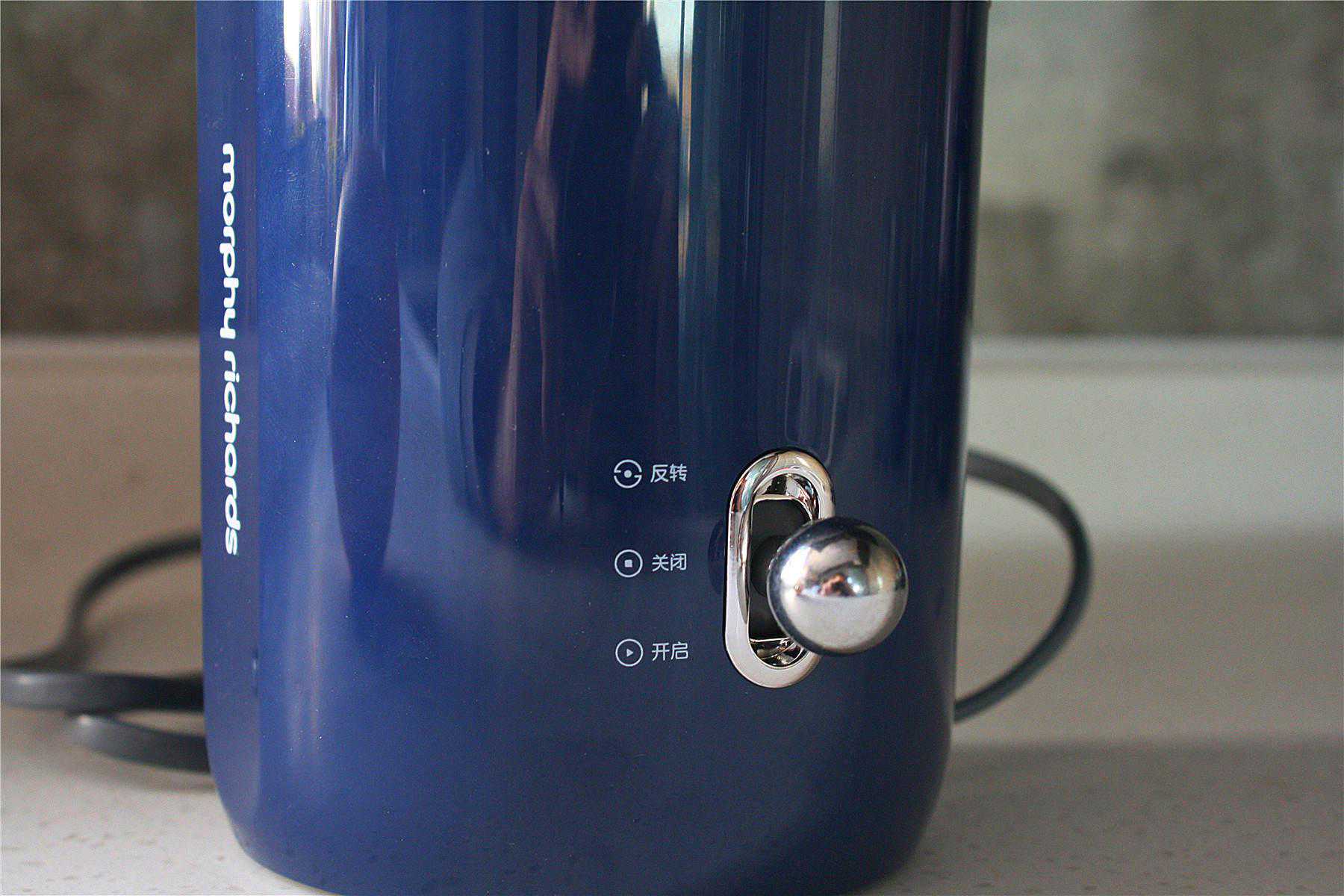 主机开关采用拨动式操作,用户可通过向下拨动开启原汁机,向上推回则关闭原汁机;摩飞原汁机与其他同类产品一样具有反转功能,不过反转功能非固定按钮,需用户长按操作,以防止用户误触,确保原汁机正常运转,提高电机使用寿命。