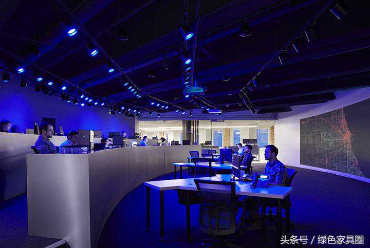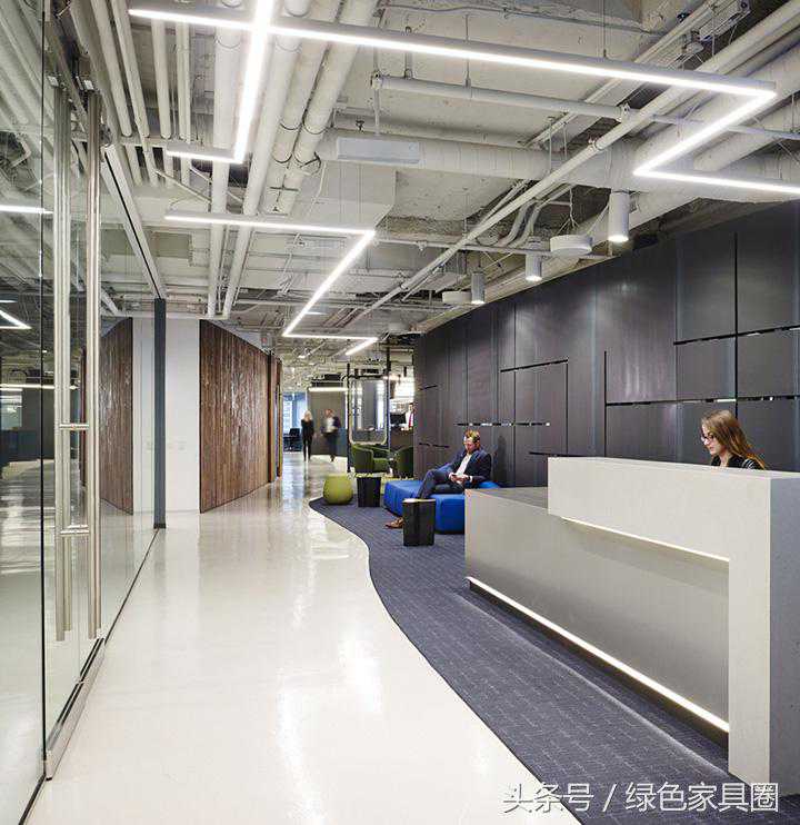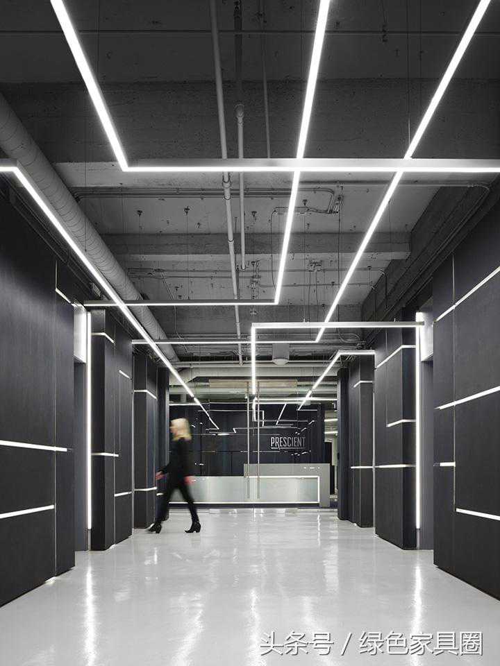 设计团队的灵感来自Prescient整合技术、大数据和监控领域的职能属性,将这些功能纳入到整个设计体系中。比如,在电梯厅的顶面采用连续的线形灯光设计,犹如持续不断的信息数据,巧妙地延展至室内空间。墙面的线形灯光技术装置,具有导向作用,将人们引领至接待区。