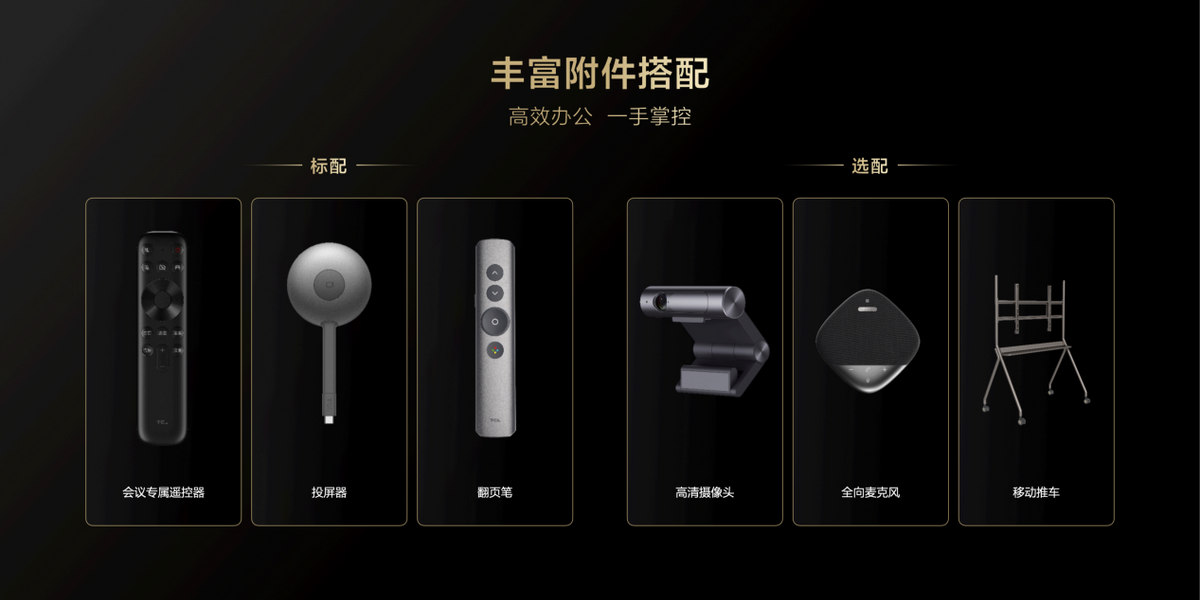 为了满足不同会场的需求,TCL办公智屏提供丰富的配件支持,包括触控笔,投屏器,翻页笔还有移动支架等等。