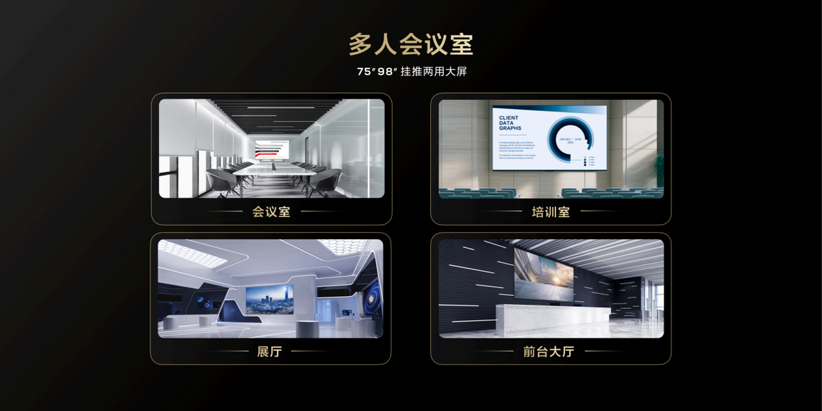 在多人会议室则可以使用75”以及98”甚至更大尺寸的产品,其超大屏的显示效果,配合专业的办公场景体验,可以显著提升会议的效果。大尺寸的办公智屏还可以挂装,也可以搭配移动推车自由组合,完美替代投影机。