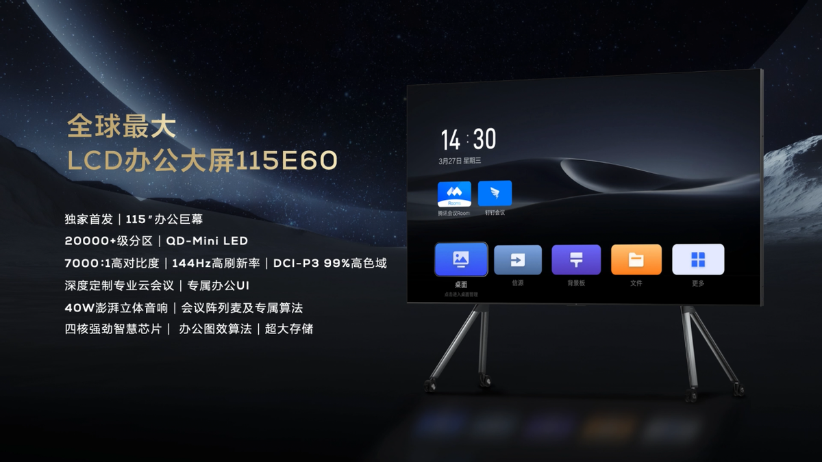 最后,TCL隆重推出115”全球最大LCD办公大屏115E60,这款大屏基于QD-MiniLED技术,能够提供极致的画质体验,为企业会议、培训、展示等多种场景,提供“更大”的解决方案,助力企业塑造高端大气的企业形象。