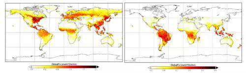 图1.TanSat卫星首幅全球叶绿素荧光产品(2017年7月,左;2017年12月,右)