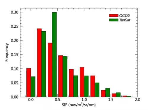 TanSat卫星叶绿素荧光产品与同期的美国OCO-2卫星产品相对比,二者在空间格局、季节变化特征等方面高度一致。进一步对比TanSat卫星叶绿素荧光产品与美国OCO-2产品的直方图,结果表明二者在取值范围、均值、动态分布等方面也非常一致。这表明TansSat卫星达到了国际最高水平。