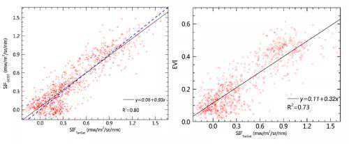 此外,为了定量评价TanSat卫星叶绿素荧光产品在植被生长状况和生产力监测方面的应用潜力,科研人员将TanSat卫星叶绿素荧光产品与OCO-2卫星产品和MODISEVI植被指数产品进行了统计对比分析。定量对比结果表明,我国TanSat卫星叶绿素荧光与OCO-2卫星叶绿素荧光、MODISEVI植被指数产品存在非常一致的正相关关系,可用来监测全球植被生长状况和植被生产力。