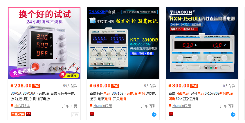但是,都有些许问题困扰。一是基于适用性和成本考虑,这里讲的适用性就是我们大多数使用时的电压范围,电流范围。这里我们用淘宝来搜索“电源模块可调电源”。销量第一的是