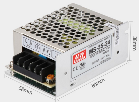 然后就是供电电源了,需要考虑放置的体积,电源的电流及电压。所以选用了明纬的24V,1.5A电源。三十元左右。电压的可调范围在10%,也就四会2.4V,调到最高输出26.4V.减去2V的输出模块降压,输出就是刚好24V。