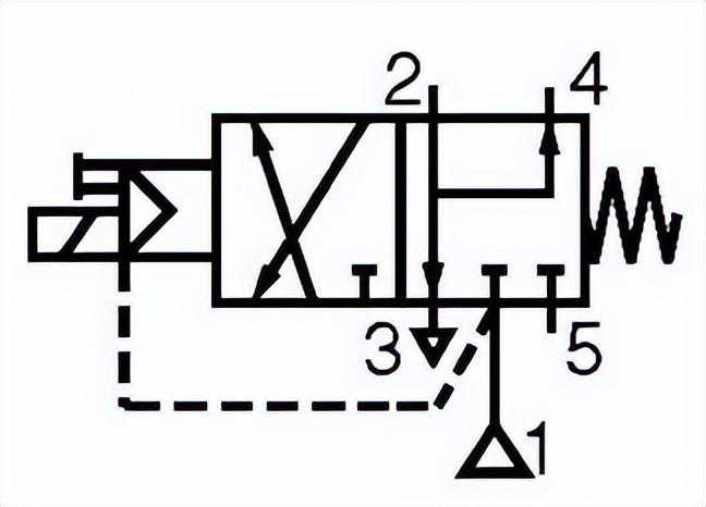 (2)电磁阀线圈失电:在电磁阀内部弹簧的作用下,推动内部阀芯,使其工作在右位,2、3、4通,1封闭。5封闭。