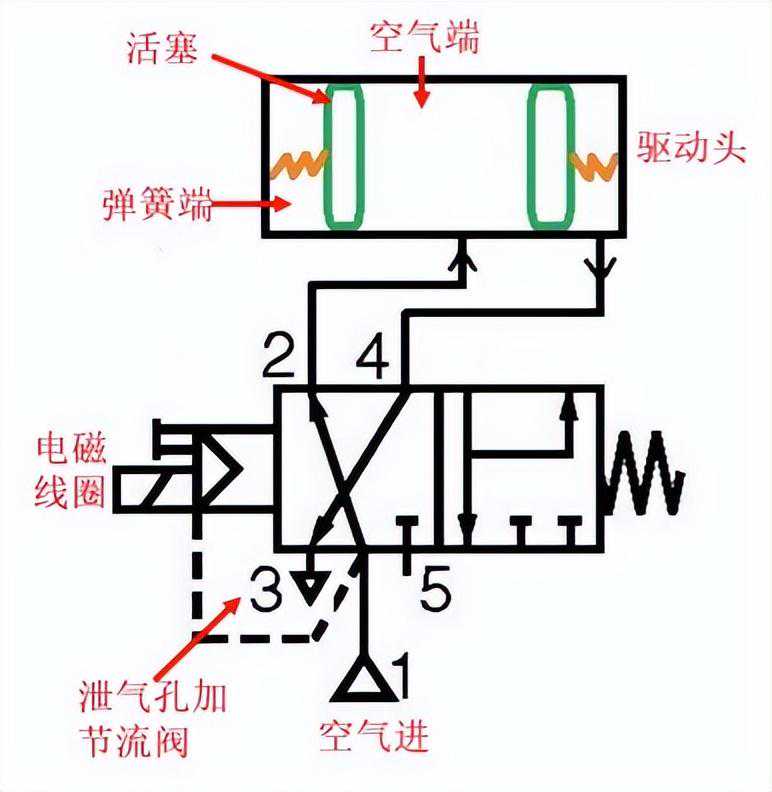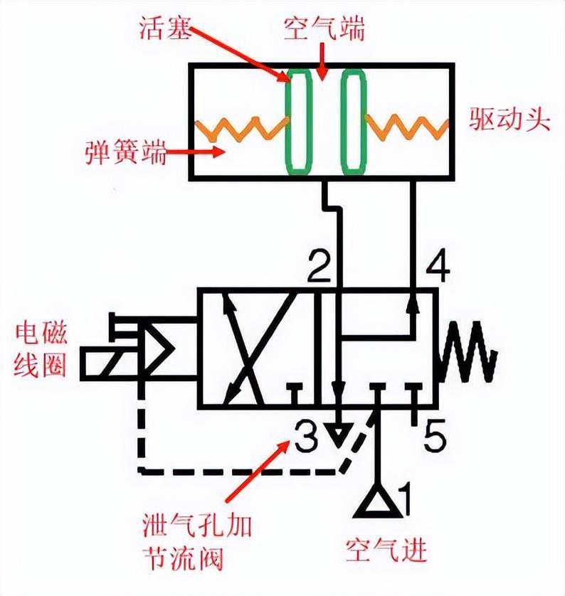 因电磁阀失电后,驱动头空气端的空气还需要经泄气孔3及节流阀泄放,适当调节泄气孔节流阀的大小即可。