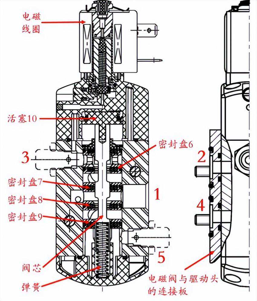 (2)电磁阀得电时,一部分压缩空气进入活塞10上部,推动活塞10与阀芯移动,以改变电磁阀内部阀芯位置。此时,阀芯与密封盘6及密封盘8密封,压缩空气通过1进入密封盘7的上部空间,再通过2进入驱动头空气端。因泄气孔3漏气,所以判断出阀芯与密封盘6密封不严。