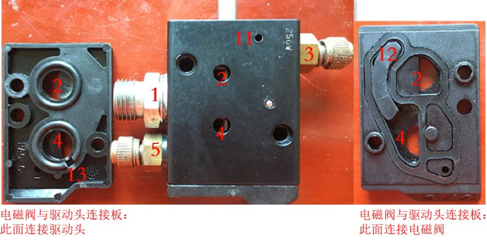 在12处加上胶条,堵住3、4的连通孔道11,电磁阀漏的气就不会进入驱动头弹簧端。