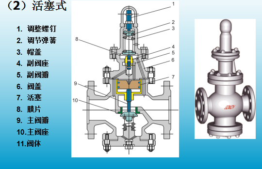 (b)先导式:由主阀和导阀组成,出口压力的变化通过导阀放大控制主阀动作;