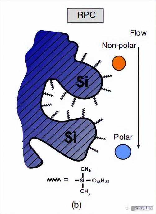 反相色谱的简化示意图如下所示,其中极性分析物首先被洗脱,而非极性分析物通过与疏水C18基团更强的相互作用而洗脱,疏水C18基团在固体硅胶载体周围形成“液体状”层。