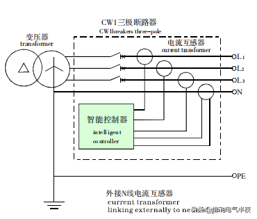 ①TN-C、TN-C-S、TN-S配电系统中选用CWl三极断路器不附加外接电流互感器;接地故障保护信号只取三相电流的矢量和;保护特性为定时限保护。如下图