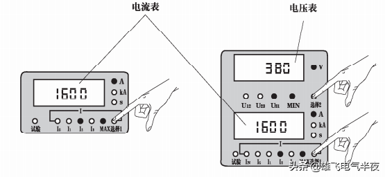 电流表:运行中显示数值为三相中最大电流值(如下图:电流表所示为三相中最大电流I2,其值为1600A)。按电流表“选择1”键,可循环选择显示I1、I2、I3、IN,IC实时值(相应指示灯亮),