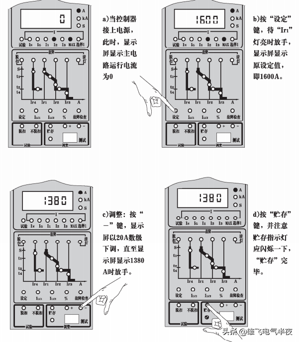 ①显示:按“设定”键至目标项如Ir1、t1、Ir2、t2、Ir4、t4、ILc1、ILc2,待某目标项灯亮,显示屏显示为该項的原设定值。
