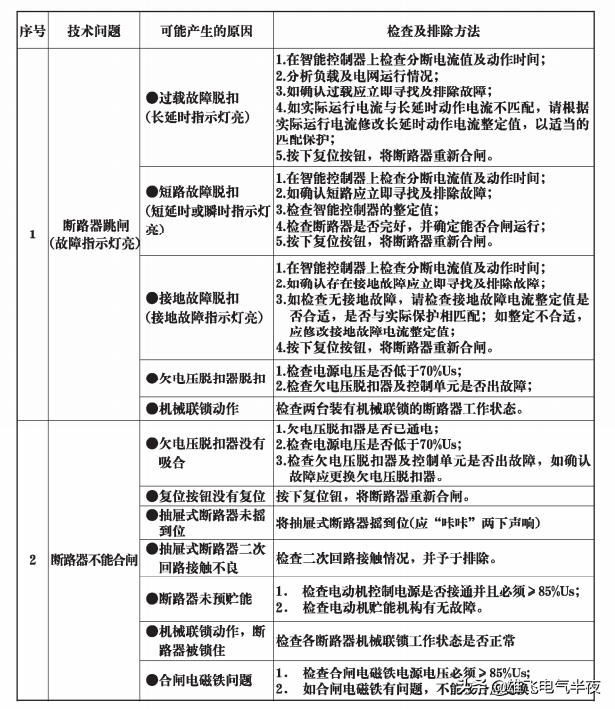 下面列举了用户在安装、调试、运行过程中,断路器可能发生的问题,并列出了可能产生的原因和检査及排除方法。见下图1、2