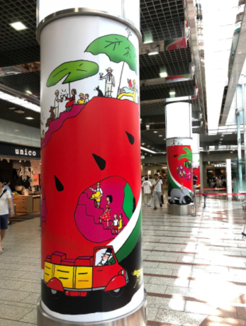 大家熟悉的《蚂蚁和西瓜》图装饰在大厅的柱子上: