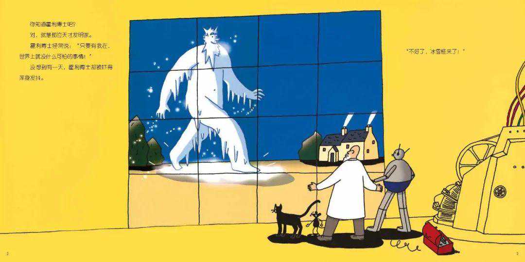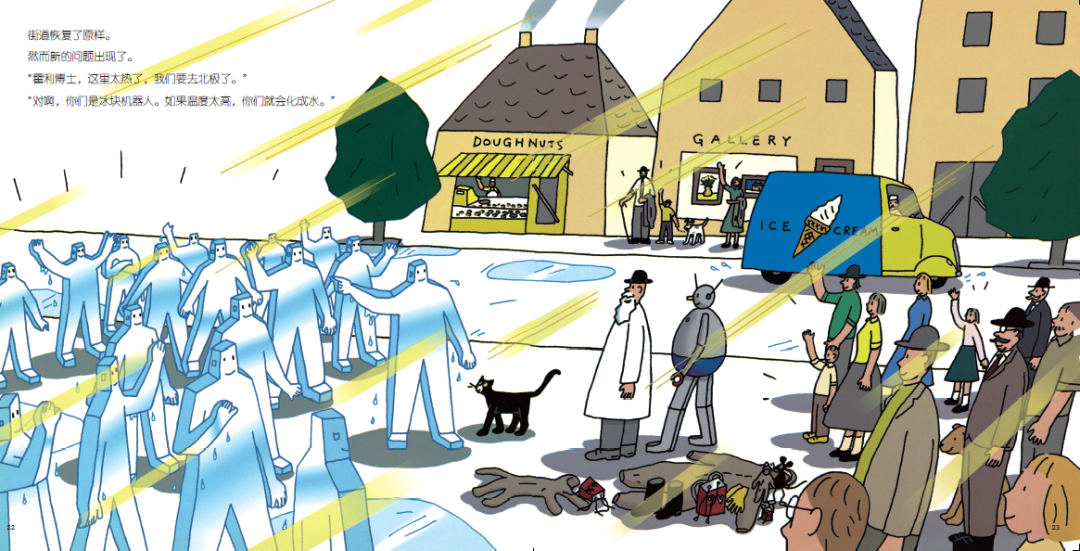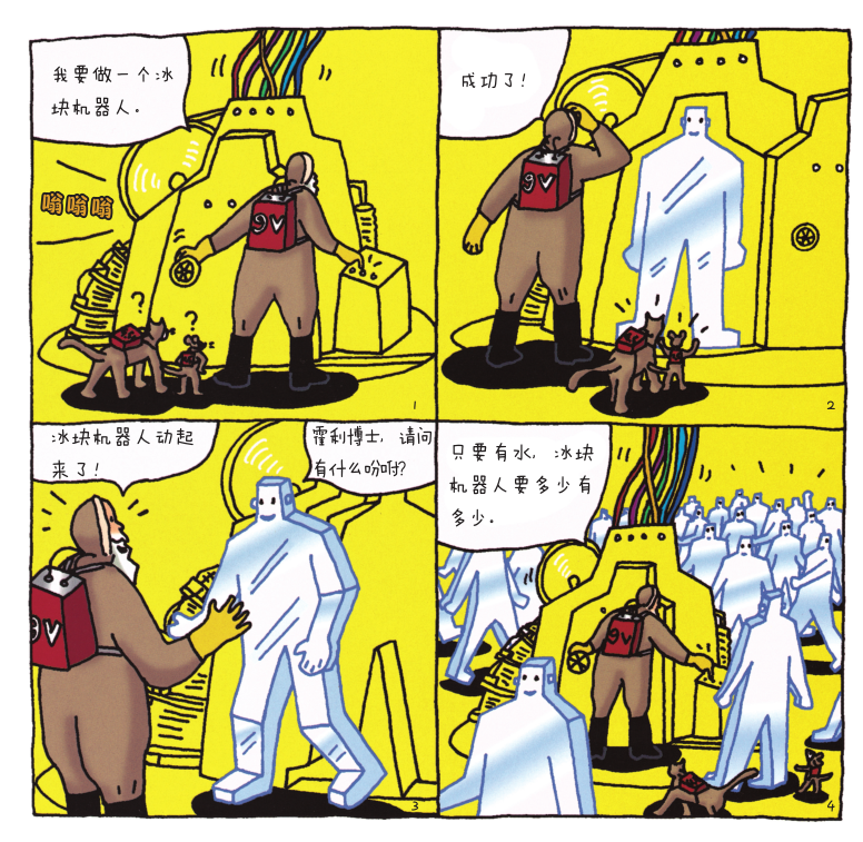 在这幅图里,透过冰雪机器人简单的线条,他们各种各样的姿势和心理活动也跃然于纸上。机器人运用杠杆原理撬动冰块的动作也各有不同