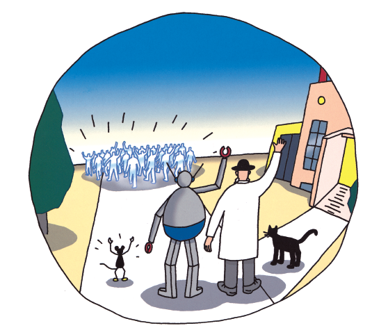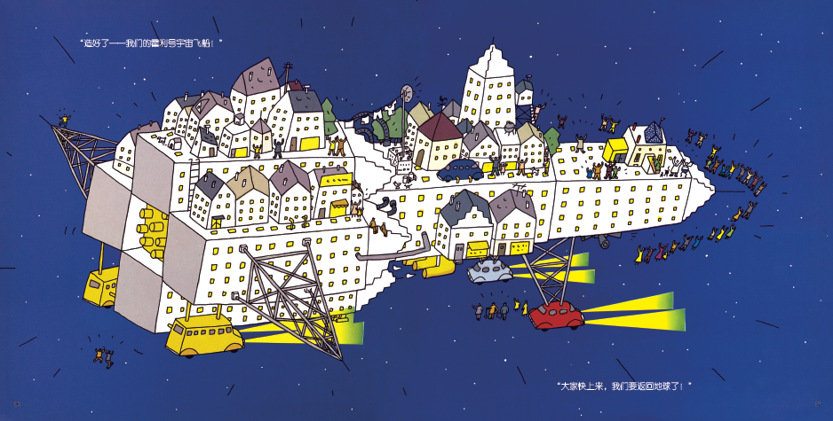 博士受到这些飘起来的事物的启发后,运用失重状态下物体可以轻易被移动的原理,指挥大家把房子搬到一起,然后用万能胶水把房子粘成一艘宇宙飞船: