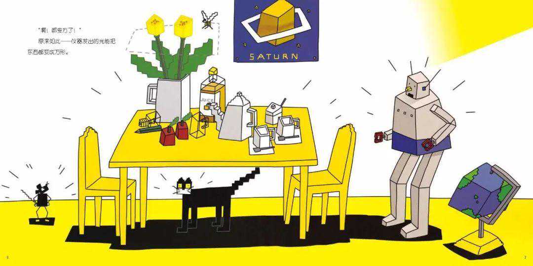 小朋友们可以在图中找找看,从杯子到花朵,从地球仪到火星,就连蜜蜂飞行的轨迹都变成了方形: