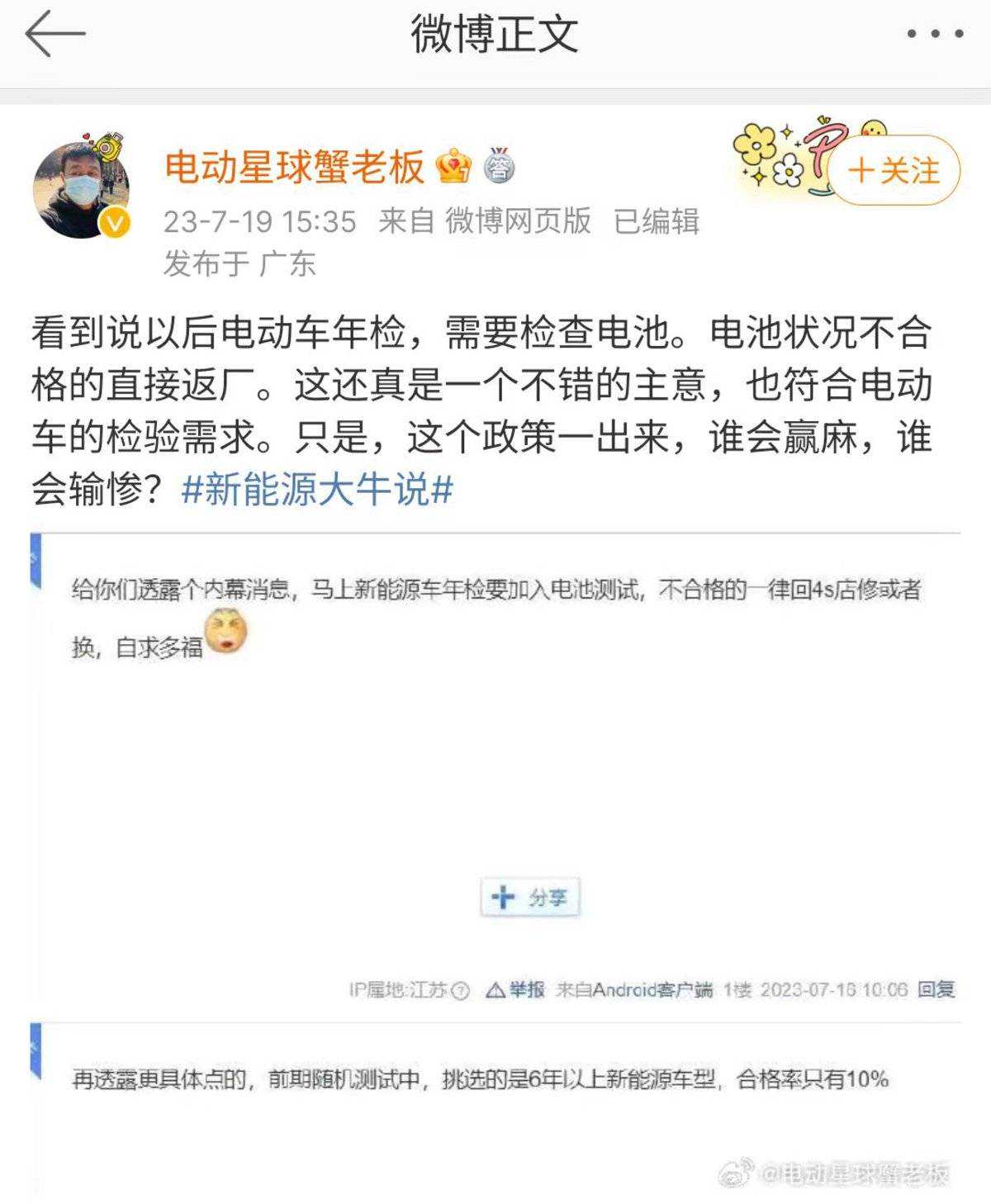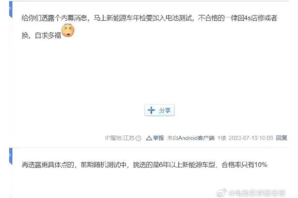 最后这位博主附上了上面这张截图,截图显示:“给你们透露个内幕消息,马上新能源车年检要加入电池测试,不合格的一律回4s店修或者换,自求多福。”
