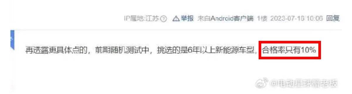 值得注意的是,在他附上的截图里面,我们还发现了另外一句话:“再透露更具体点的,前期随机测试中,挑选的是6年以上的新能源车型,合格率只有10%。”如果这张截图属实的话,那么未来电动车主的日子可能会非常难过。