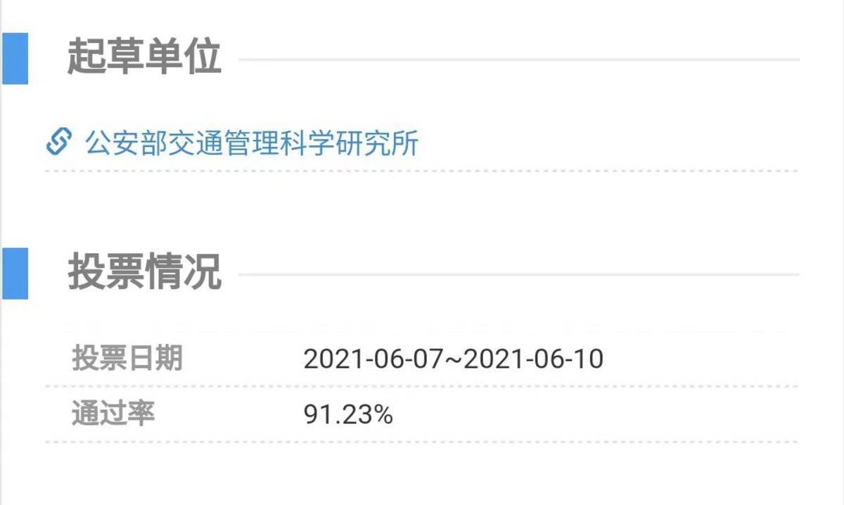 这条标准现在还在征求意见期间,其起草单位为公安部交通管理科学研究所,在投票情况一栏中我们能够看到,在2021年6月7日到2021年6月10日的投票期间,其通过率达到了91.23%,虽然我们不知道多投票通过率达到多少能够得到批准执行,但从数据上来看,它的通过率并不低。