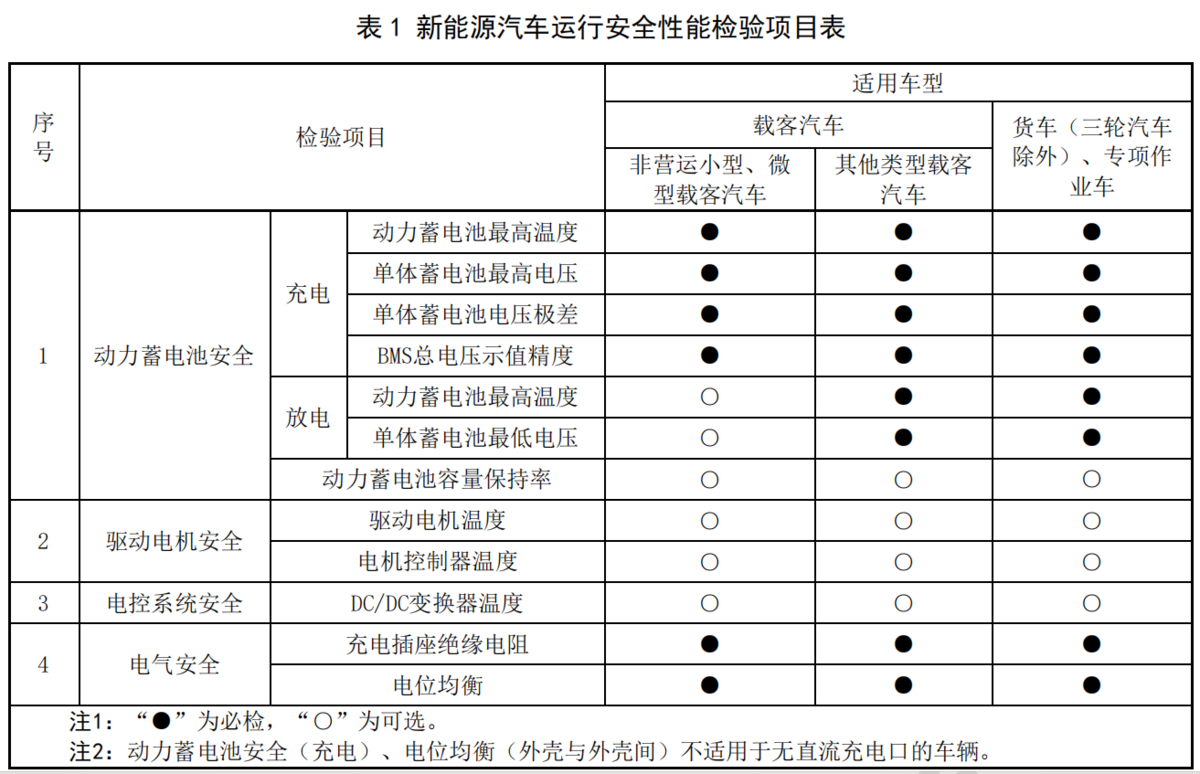 以下面这张截图为例,这是新能源汽车运行安全性能检验项目的明细表,在这里面我们能够看到在动力蓄电池安全项目里,有一条名为动力蓄电池容量保持率的项目,虽然其标注为可选项目,但电池容量确实在测试内容中。