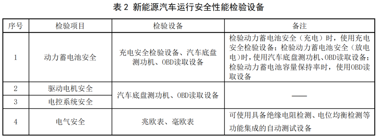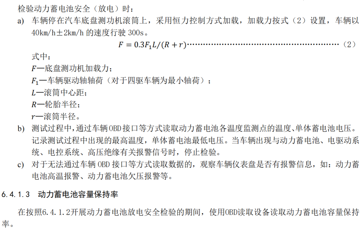 而在下方,我们在新能源汽车运行安全性能检验设备一栏中,也看到了对电池容量保持率的设备要求:“检验动力蓄电池容量保持率时,使用OBD读取设备。”