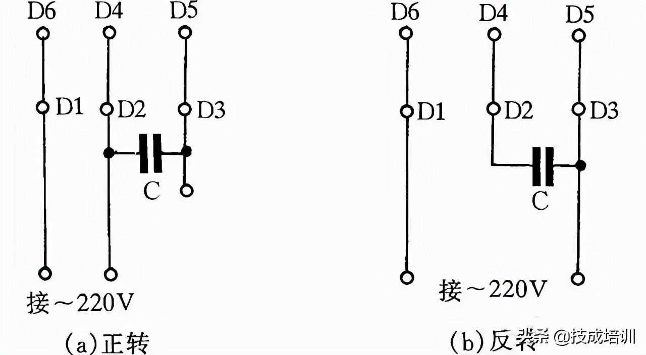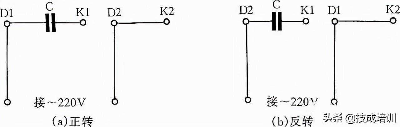 图4是JX07A-4型单相电容运转电动机接线方法。电动机功率为60W,用220V/50Hz交流电源、电流为0.5A。它的转速为每分钟1400转。电容选用耐压400~500V、容量8μF的产品。图4(a)为正转接线,图4(b)为反转接线。