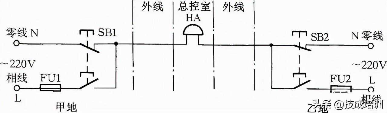 23.用单线向控制室发信号线路图23所示线路可使甲乙两地都能向总控制室发联络信号。当甲地向总控制室发信号时,按下按钮SB1,控制室的电铃告警。同理当乙地向总控制室发信号时按下SB2即可。甲乙两地信号可用信号铃声的时间长短或次数区分。