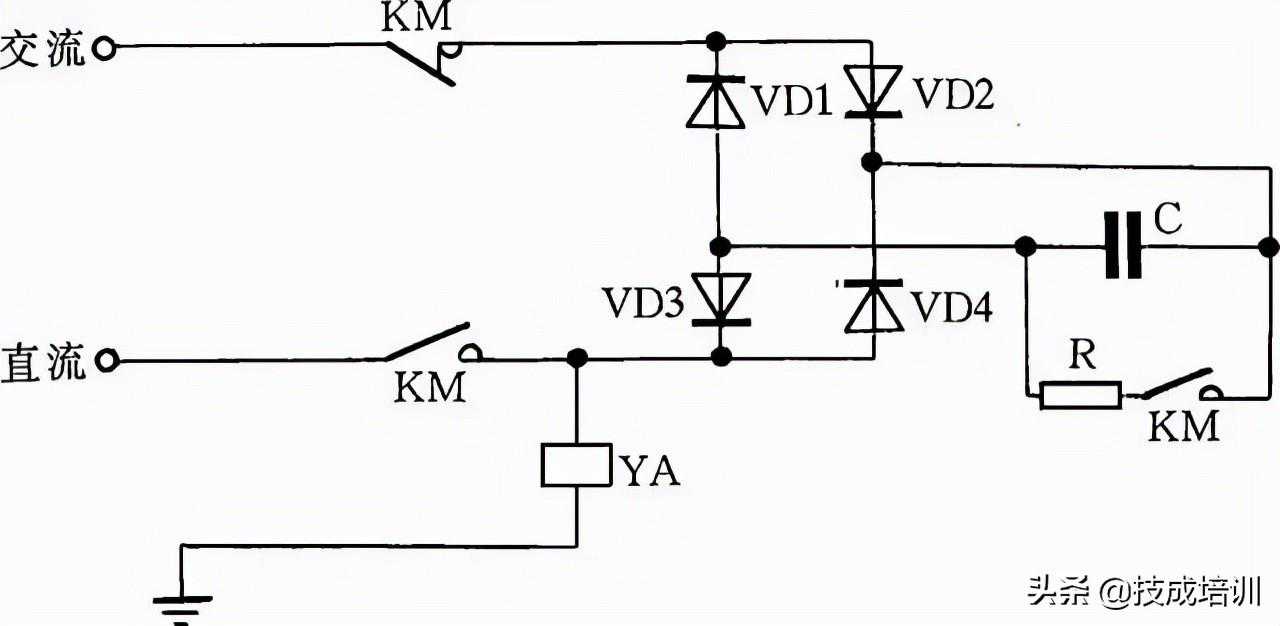 9.直流电磁铁快速退磁线路直流电磁铁停电后,因有剩磁存在,有时会造成不良后果。因此,必须设法消除剩磁。图9中,YA是直流电磁铁线圈,KM是控制YA启停的接触器。KM吸合时,YA通电励磁;KM复位时,YA断直流电,并进行快速退磁。