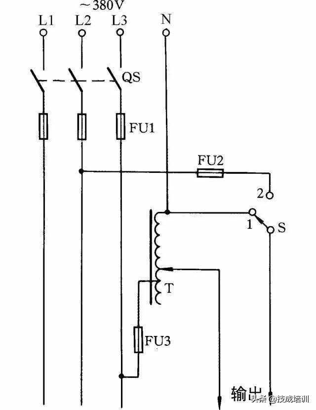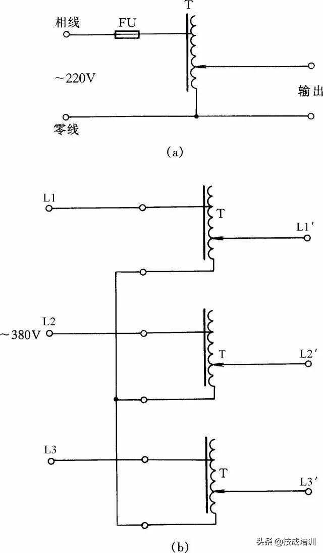 35.单相、三相自耦调压器的接线单相自耦调压器在工厂等应用极为广泛。其接线线路如图35(a)所示。