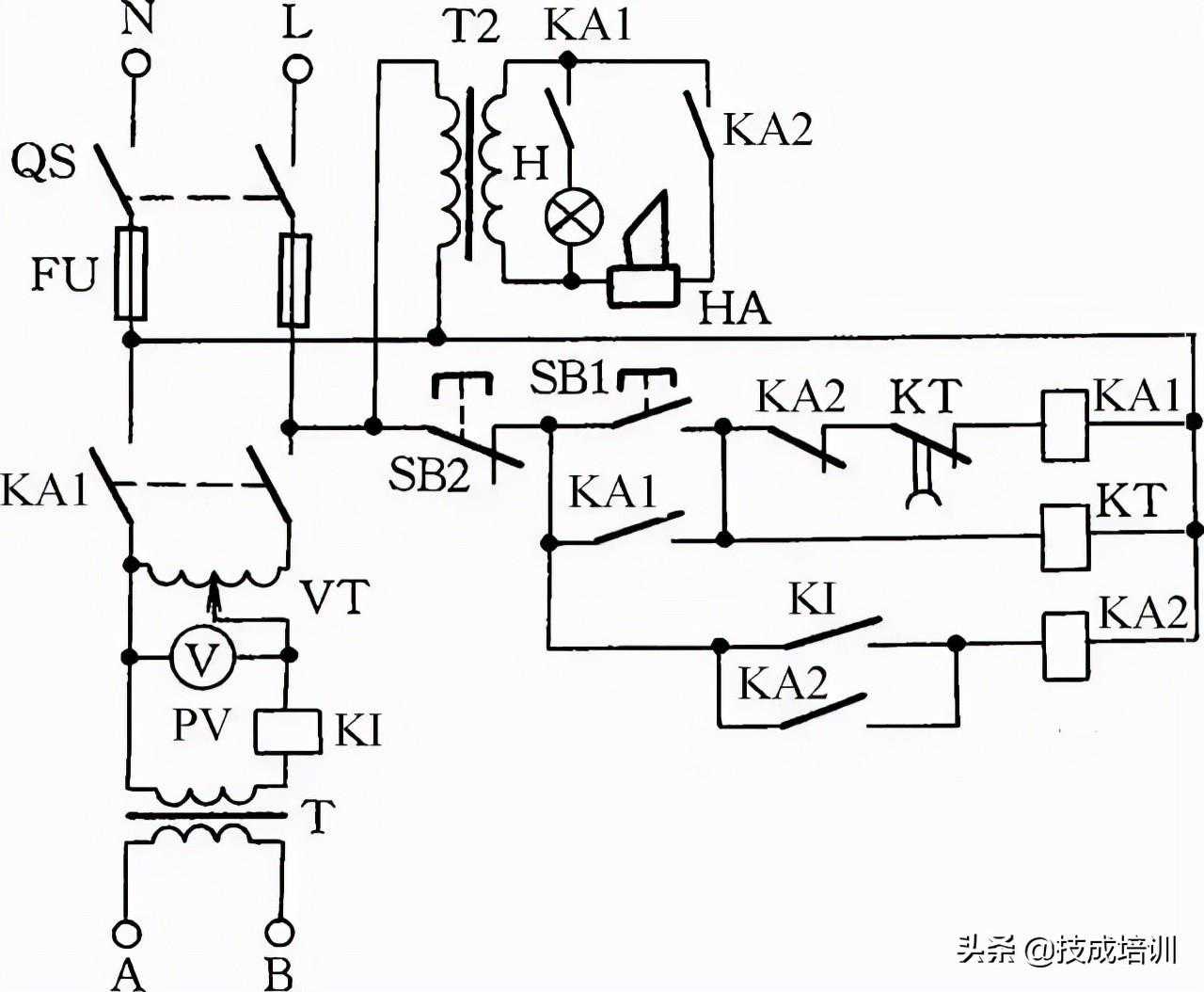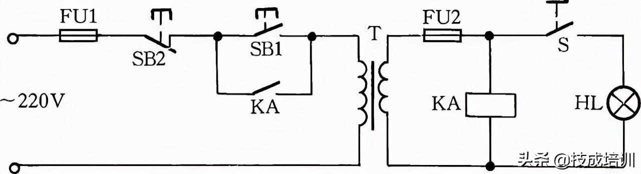 工作原理:闭合S后,按下按钮SB1,变压器得电输出36V低电压,使得继电器或交流接触器KA吸合。放松按钮SB1后,KA自锁触点使KA保持吸合,继续给变压器接通电源。如果变压器次级发生短路故障,继电器线圈电压为零,此时KA便失电释放,将变压器电源断开,保护变压器不被破坏。
