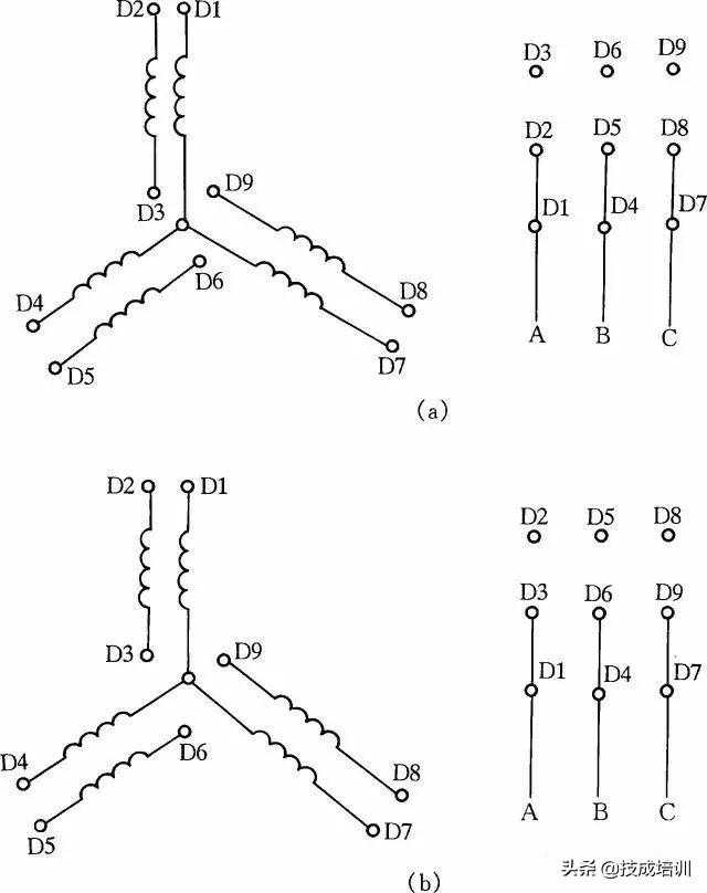 8.双速电动机2Y/2Y接线方法图8所示是2Y/2Y电动机双速定子线组的引出线接线方法。