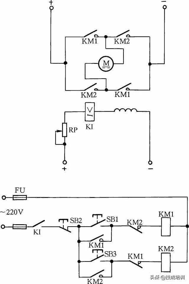 在励磁电路内,串联一个欠电流继电器KI,其常开触点接在控制电路中。当励磁电流消失或减小到设定值时,KI释放,KI常开触点断开,切断电动机电枢电源,使电动机停转,从而避免超速现象发生,见图11。