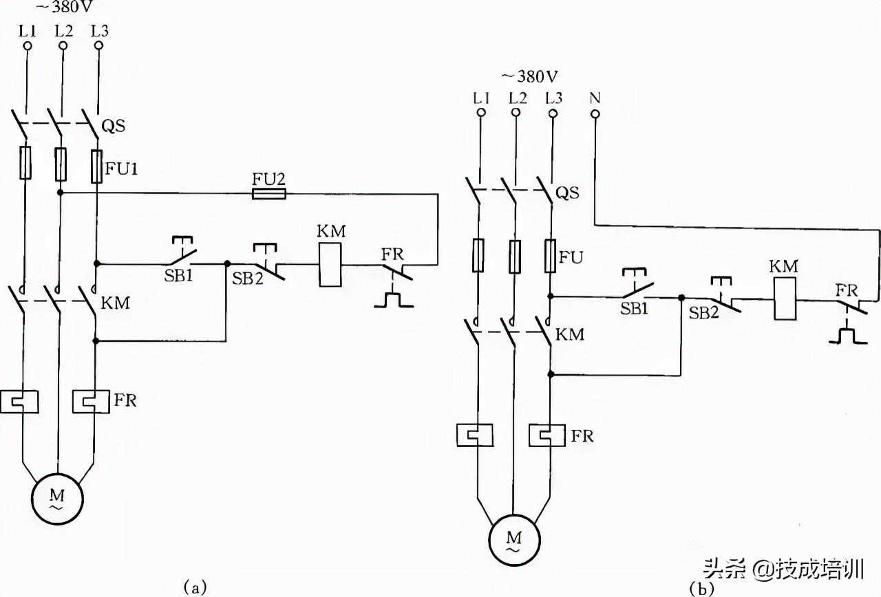 接触器线圈电压为380V时,可按图12(a)所示接线;接触器线圈电压为220V时,可按图12(b)接线。图12(a)的接线还有缺陷,即在电动机停转时,其引出线及电动机带电,使维修不大安全。因此,这种线路只能在应急时采用,并在维修电动机时,应断开控制电动机的总电源开关QS,这一点应特别注意。