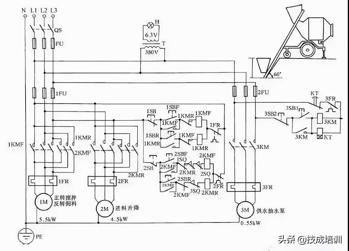 当升到一定高度后,料斗挡铁碰撞行程开关1SQ和2SQ,使2KMF断电释放。这时料斗已升到预定位置,把料自动倒到搅拌机内,并自动停止上升。此时操作人员按下下降按钮2SBR时,卷扬系统带动料斗下降,待下降到其料口与地面平齐时,挡铁碰撞行程开关3SQ,使2KMR接触器断电释放,自动停止下降,为下次上料做好准备,这时搅拌机料已备好,操作人员再按下3SB1,3KM接触器得电吸合,使供水抽水泵电动机3M运转,向搅拌机内供水,与此同时,时间继电器KT得电工作,待供水与原料成比例后(供水时间由KT时间继电器调整确定,根据原料与水的配比确定),KT动作延时结束,从而使3KM自动释放,供水停止。加水完毕即可实施搅拌。按下1SBF正转按钮,1KMF得电吸合,1M正转搅拌,搅拌完毕后按下1SB停止按钮即可停止。出料时,按下1SBR按钮,1M反转即可把混凝土泥浆自动搅拌出来。然后按下1SB,接触器1KMR断电释放,1M停转,出料停止。