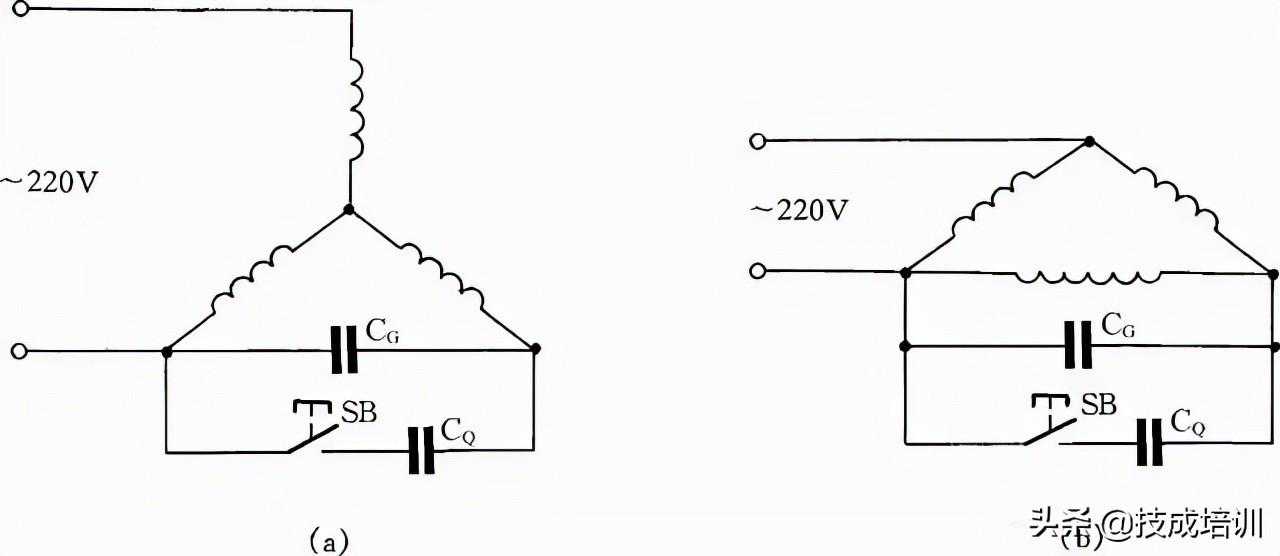 如图19所示:图(a)为Y形接法电动机连接方法,图(b)为△形接法电动机连接方法。为了提高启动转矩,将启动电容CQ在启动时接入线路中,在启动完毕后退出。