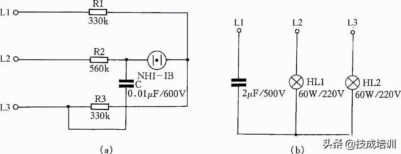 工作原理:由于电容移相,改变了其中一相的相位差,作用到HL1和HL2上的矢量电压不等,其规律是L2相矢量电压大于L3相矢量电压。故按图25(b)连接后,电容接电源L1相,那么可知灯泡光线较强的一端是L2相,光线弱的一端则为L3相。