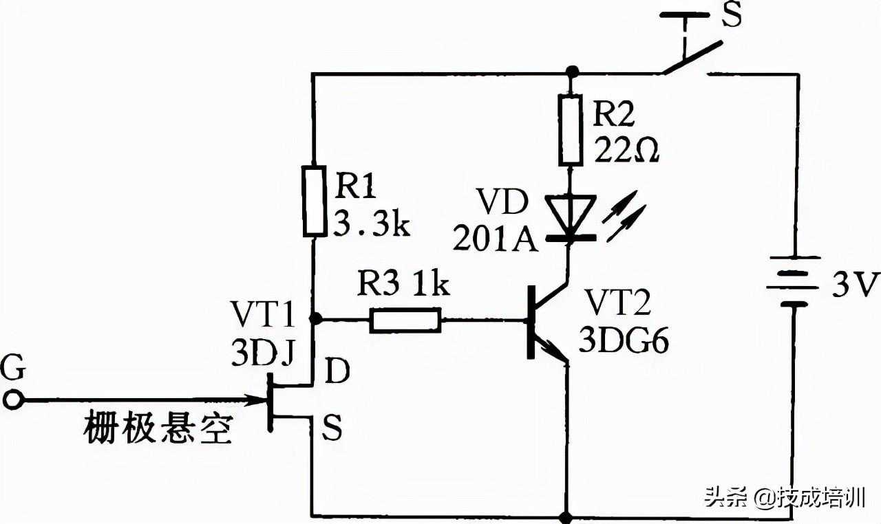 28.一种简易测量导线通断的接线方法图28所示是一感应测电笔线路。它可方便地测出导线的断芯位置。在用来测导线断芯位置时,在导线一端接上220V的电源相线,然后用感应测电笔的探头栅极靠近被测导线,并沿线移动。如果发光二极管在移动中突然熄灭,那么此处便是导线断芯位置。