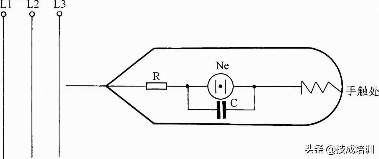 36.自制一种能消除感应电的验电笔在测验三相交流电时,如果带电的线路较长,即使三相交流电缺一相电源,用一般的验电笔测试也很难判断出是哪根电线缺相(因为线路较长,并行的线与线之间产生的电容容量增大,使不带电的某一根电线产生感应电)。为了快速、准确地判断,可在一般的低压验电笔的氖泡上并联一只1500pF小电容,这样在测强电时,电笔照常发光。而测得的是感应电时,感应电会通过电容再经过人体被大地吸收掉,所以电笔不发光。在自制这种验电笔时应把电笔上串联的保护电阻放在测电笔线路的最前端以保障安全,见图36。