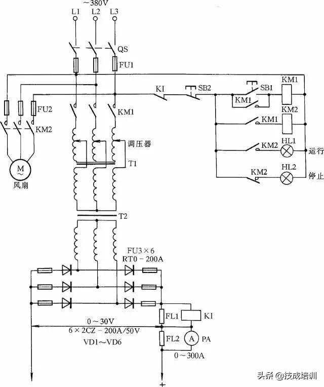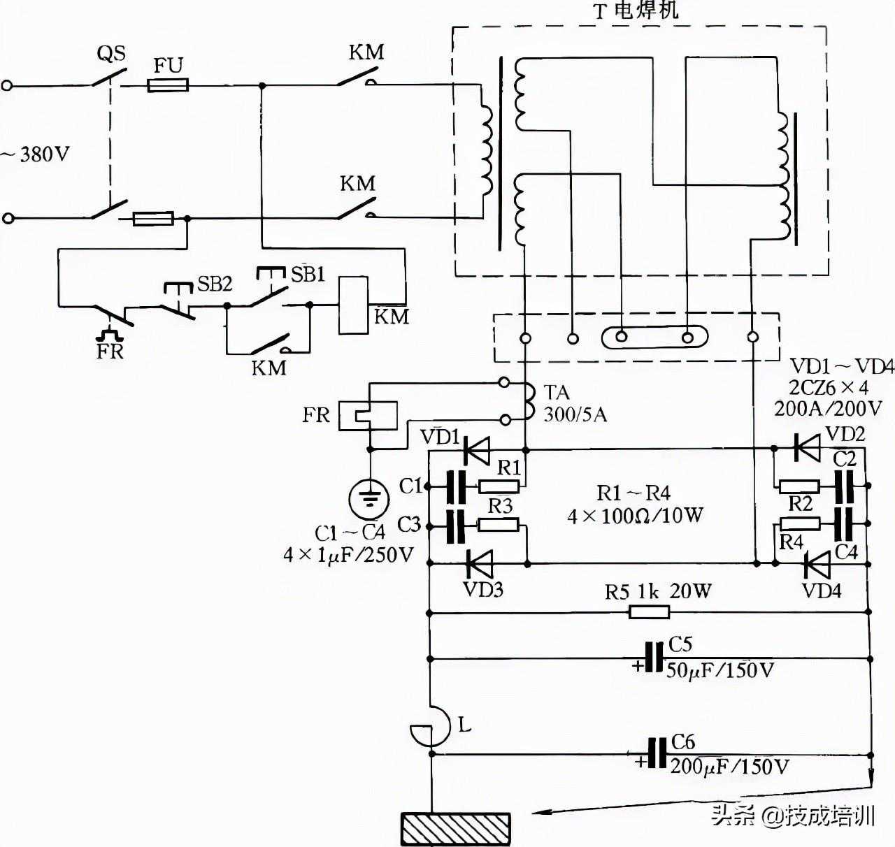 电路中VD1~VD4为4只硅整流二极管;R1~R4、C1~C4组成硅整流器件的过压保护电路;FR为过流继电器,保护硅整流器件。当负载电流超过额定值时,电流互感器次级电流相应增加,带动继电器FR动作,FR常闭触点打开,接触器KM释放,触点打开切断电焊机电源。硅整流器件用0.25kW风扇作风冷设备。图中,C5为滤波电容,R5为泄放电阻。