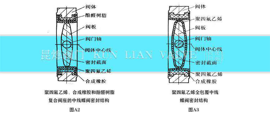 图A1所示密封结构采用了聚四氟乙烯、合成橡胶构成复合阀座。其特点在于阀座的弹性仍然由合成橡胶提供并利用聚四氟乙烯的摩擦因数低、不易磨损、不易老化等特性,采用聚四氟乙烯作为阀座密封面材料,从而使蝶阀的寿命得以提高。